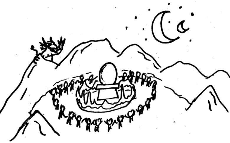 Great Mara mothered hundreds upon hundreds of children in the forms of high mountains and deep valleys, of swift rivers and sleeping lakes. These are the da-Muntus.¹ We sing to them and sacrifice to them, for in this way we honour the living world.Then Mara lay down to rest and looked up into the sky. She was saddened to see an unbreathed hollow. There was no one to dance, no one to rise and fall, no one to gladden the watcher below. So Mara sent her daughter to change this.Ki-Nara² spread her wings and flew up into the sky. With her feet, she pierced it and made a hole, and from that hole she shaped a mouth. She suckled the mouth from her lower third breast,³ just as her mother had taught her. Ki-Nara fed it bright milk, and life entered the world above.The sky-mouth swelled and grew heavy with life. In time, it gave birth to its first children, the Ten Rirlan.⁴ They were ever joyful, dancing and singing, with rattles, drums, and flutes in their hands. Their coming was so full of joy that even Mara rose up among them and danced as well, bringing about the birth of more lights.And all the world was pleased by this. Since then, ki-Nara has been honoured forever, and people dance and sing in her praise, with bells bound around their ankles.